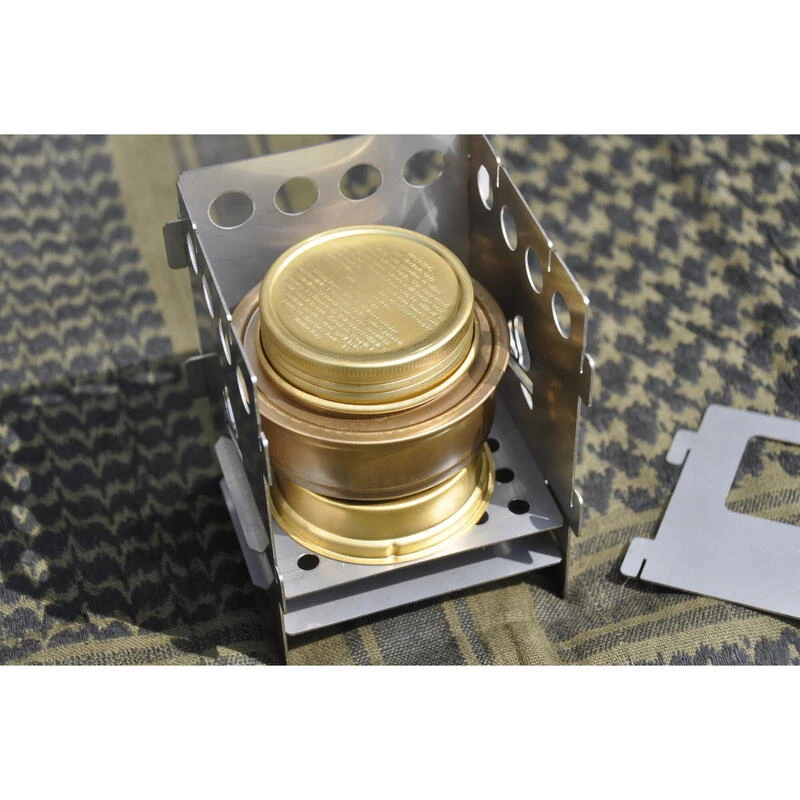 Notre réchaud Titanium ultra-fin multi-combustible, compatible avec du bois, d’autres matières organiques, Trangia et Esbit. Livré avec deux supports pour chaque taille de pot. Peut également servir